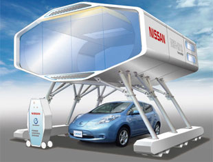 Nissan baut jetzt auch E-Häuser: Auf der Elektronikmesse CEATEC bei Tokio hat Nissan gestern das Konzept „Leaf to Home“ vorgestellt. Ein auf Stelzen gebautes und futuristisch anmutendes Haus bindet die Batterie das darunter geparkten Leaf ins Hausnetz ein. Auf dem Dach erzeugen Solarmodule Strom, zusätzlich ist eine Brennstoffzelle in das System integriert. Das energieautarke Wohnen will Nissan ab Ende 2012 offenbar ernsthaft in Japan anbieten.