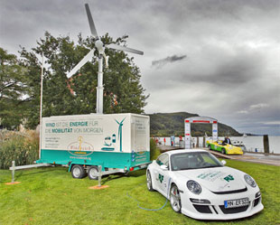 Windkraft aus dem Anhänger: Die Windreich AG hat beim „Haldenhof Revival“ in Ludwigshafen gezeigt, was technisch alles machbar ist – eine mobile Wind-Ladestation. Auf einem Anhänger war eine bis auf zehn Meter ausfahrbare 3,5-kW-Windkraftanlage montiert. Als Pufferbatterie dient ein Lithium-Akku mit 50 kWh Kapazität im Rumpf. Das System kann rechnerisch vier kompakte E-Autos mit durchschnittlich 10.000 km Fahrleistung pro Jahr mit Strom versorgen.