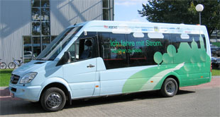 RWTH Aachen testet Elektro-Bus: Das Institut für Kraftfahrzeuge hat einen Sprinter City 65 von Mercedes Benz auf E-Antrieb umgerüstet. Die Batterie wurde mit 45 kWh für einen Bus relativ kompakt dimensioniert, um mehr Platz für Fahrgäste zu lassen. Dafür wird der E-Bus, der nun bei den Achener Vekehrsbetrieben eingesetzt wird, mehrmals am Tag mit einem 60 kW Gleichstrom-Schnellladesystem geladen.