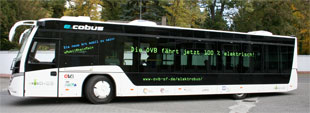 Details zum Offenbacher Elektro-Bus: Der neue E-Bus des Wiesbadener Herstellers Contrac, der ab Montag im Linienbetrieb durch Offenbach rollt, ist mit einem permanenten Magnetmotor ausgestattet und zieht seinen Strom aus sieben Lithium-Ionen-Batterien mit einer Gesamtkapazität von 150 kWh. Damit kommt der E-Bus auf eine Reichweite von 120 bis 160 km.