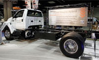 Ford stellt Plug-in-Truck vor: Der Ford F-750 ist mit einem Plug-in-System von Odyne ausgestattet. Insgesamt 28 kWh Batterie-Kapazität von Johnson Controls erlauben weitreichenden E-Betrieb. Allerdings hat der E-Lkw auch einen stattlichen Preis: Je nach Ausstattung sind rund 100.000 Dollar fällig.