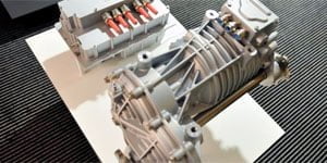 Elektrisches Achsmodul von ZF: Der Zulieferer hat einen 45 Kilo schweren E-Antrieb für kleine und mittlere Pkw im urbanen Verkehr entwickelt und zur Präsentation in einem E-Auto verbaut. Das System leistet bis zu 90 kW in der Spitze und besteht aus Asynchron-Elektromotor, Übersetzungseinheit, Leistungselektronik und Steuersoftware. ZF will damit Permanentmagnet-Motoren ausstechen. Den Gewichtsnachteil habe man „überkompensiert“, so ZF.