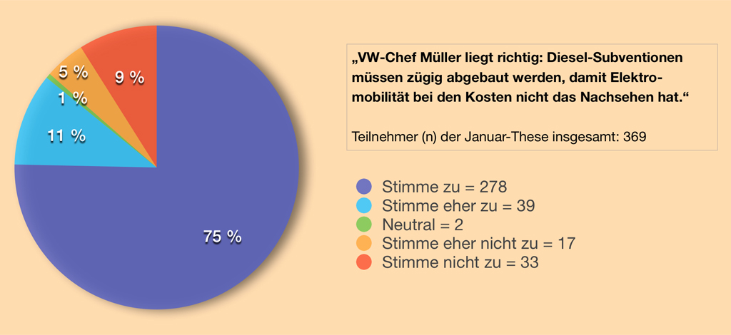 VW-Konzernchef Matthias Müller forderte kürzlich ein Ende der Steuervorteile für den Diesel, um der Elektromobilität auf die Sprünge zu helfen. Der Vorstoß sorgte für heftige Diskussionen in der Autobranche. Deshalb haben wir Sie im Januar über das Thema abstimmen lassen: Nun liegt die Auswertung dieser rekordverdächtigen These des Monats vor.