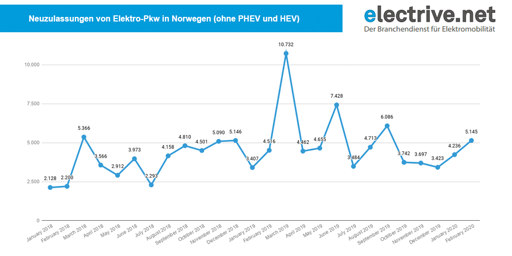 Im Vergleich zum Vorjahresmonat war dies ein Plus von 13,9 Prozent. Musste Norwegen in den letzten drei Monaten 2019 noch Rückgänge bei den Elektro-Zulassungen verzeichnen, ging es im neuen Jahr wieder bergauf. Im Januar kamen 4.236 Elektro-Pkw neu auf die Straße. Mit den Februar-Fahrzeugen sind es in Summe schon rund 10.000 Stromer allein in 2020.