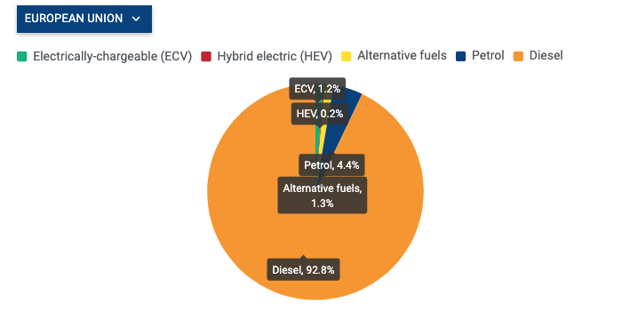 Bei den Bussen liegt laut der ACEA-Statistik der E-Anteil bei 4,0 Prozent. Hybridbusse kommen auf 4,8 Prozent, jene mit alternativen Kraftstoffen auf 6,2 Prozent. Die überwiegende Mehrheit (85 Prozent) sind immer noch Dieselbusse – aber die Nachfrage ging hier um 3,1 Prozent auf 34.123 Einheiten zurück. In vier der fünf großen EU-Märkte gab es bei den Dieselbussen Verluste: Spanien (-13,8%), Großbritannien (-12,0%), Italien (-11,8%) und Deutschland (-10,1%). Frankreich war der einzige Markt, der ein moderates Wachstum (+ 2,4%) bei der Registrierung neuer Dieselbusse verzeichnete. Benziner spielen weiterhin keine Rolle: 2019 wurden in der gesamten EU nur acht solche Fahrzeuge zugelassen.