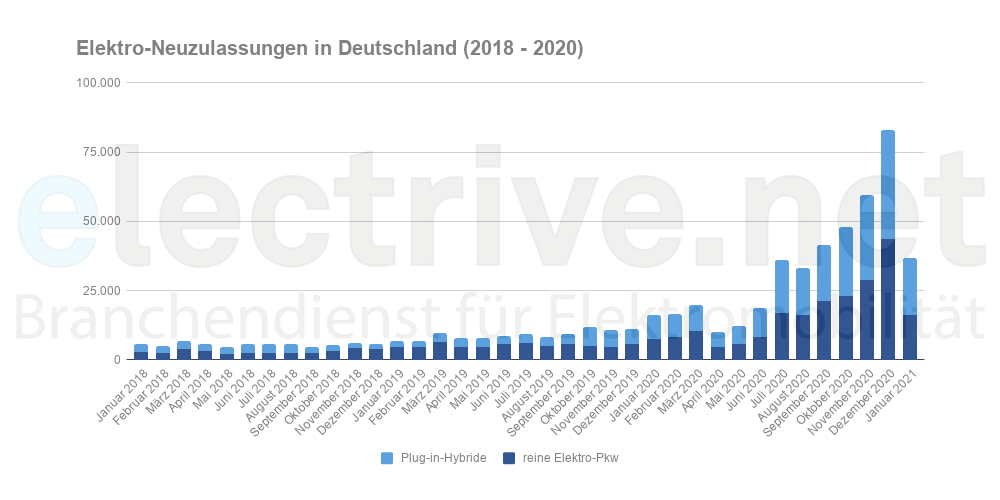 Zu den 16.315 Batterie-elektrischen Pkw kamen im Januar 45.449 Hybrid-Pkw hinzu, was einem Wachstum von 47,5 Prozent entspricht. Unter den Hybriden waren auch 20.588 Plug-in-Hybride. Hier lag das Wachstum im Vergleich zum Januar 2020 bei 138,3 Prozent.