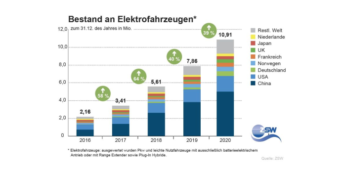 Auf 10,9 Millionen Fahrzeuge ist laut einer neuen Analyse des ZSW im Jahr 2020 der weltweite Bestand an Pkw und leichten Nutzfahrzeugen gestiegen, die einen Batterie-elektrischen Antrieb, Plug-in-Hybrid oder Range Extender haben. Bei den Neuzulassungen hat Deutschland die USA überholt.