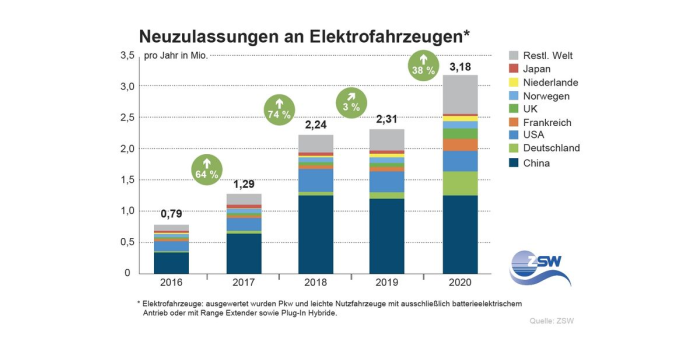 Auf 10,9 Millionen Fahrzeuge ist laut einer neuen Analyse des ZSW im Jahr 2020 der weltweite Bestand an Pkw und leichten Nutzfahrzeugen gestiegen, die einen Batterie-elektrischen Antrieb, Plug-in-Hybrid oder Range Extender haben. Bei den Neuzulassungen hat Deutschland die USA überholt.
