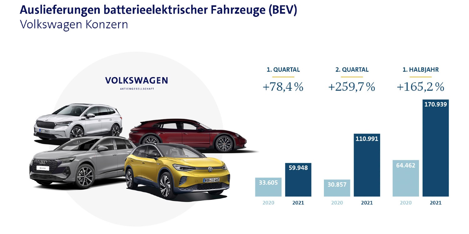 Der Volkswagen-Konzern hat im ersten Halbjahr 2021 mehr als doppelt so viele Elektroautos ausgeliefert wie im Vorjahreszeitraum (+165,2 Prozent). Konkret wurden bis Ende Juni weltweit 170.939 Batterie-elektrische Autos des Konzern verkauft, 110.991 davon allein im zweiten Quartal.