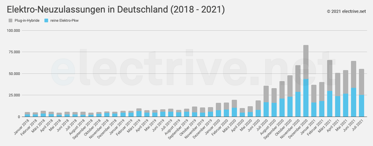 Das gilt bedingt auch für die Elektroautos. Im Gegensatz zum Juli-Gesamttrend konnte dieses Segment im Vergleich zum Vorjahresmonat zwar um 51,6 Prozent auf genannte 25.464 Einheiten zulegen. Im Vergleich zum Juni (+311,6 Prozent) hat sich das Wachstum aber deutlich abgeschwächt.