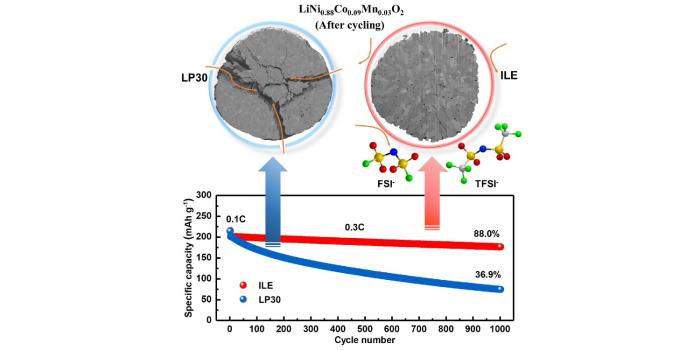 Laut einem Artikel, den das Forscherteam im Fachmagazin „Joule“ veröffentlicht haben, wurden diese Ergebnisse mit einer „vielversprechenden neuen Materialkombination“ erzielt. Für die hohe Energiedichte wurde eine kobaltarme, nickelreiche Schichtkathode (NCM88) eingesetzt. Mit dem üblicherweise verwendeten kommerziell erhältlichen organischen Elektrolyten (LP30) war die Stabilität nicht gut – nach 1.000 Zyklen wies die Zelle nur noch 36,9 Prozent der Kapazität auf.