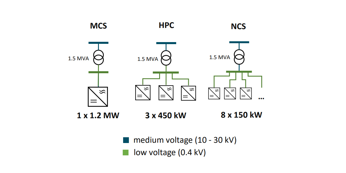 Konkret wurden drei Arten von Ladestationen untersucht, die alle über einen 1,5-MVA-Netzanschluss an die Mittelspannung angeschlossen werden: Für die kürzesten Ladevorgänge einen Megawatt-Schnelllader (MCS) mit 1,2 MW Ladeleistung, drei HPC mit jeweils 450 kW oder acht Über-Nacht-Lader (Overnight Charging System, NCS) mit 8x 150 kW. „Die drei prototypischen Ladestationen decken einen großen Teil der Ladeinfrastruktur ab, die für die zukünftige Umstellung auf Batterie-elektrische Langstrecken-Lkw benötigt wird. Sie sind technisch machbar und die angebotenen Service Levels passen zu den aktuellen betrieblichen Prozessen von Logistikunternehmen“, heißt es dazu in der Studie.