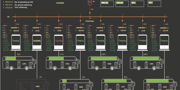 Die Software von PSI Transcom bestimmt am Ende eines jeden Tages, welche Aufgabe ein Fahrzeug am kommenden Tag erhält. Diese Fahrtreihenfolge ermöglicht es dem System, jeden E-Bus an die richtige Parkposition zu dirigieren, damit er am nächsten Morgen das Depot in der richtigen Reihenfolge verlassen kann. Darüber hinaus wird die Software den gesamten Ladevorgang ausgehend vom SOC (State of Charge) bei der Ankunft und unter Berücksichtigung des Batteriebedarfs des nächsten Tages so kosteneffizient wie möglich steuern. Der automatisierte Ladevorgang wird eingeleitet, sobald der Fahrer den CCS2-Stecker der zugewiesenen Parkbucht mit dem Fahrzeug verbindet.