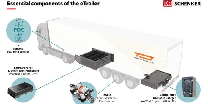 Beim eTrailer der Aachener Firma handelt es sich um einen Sattelauflieger mit eigenem Elektroantrieb. Dieser reagiert auf das Fahrverhalten seiner gekoppelten Zugmaschine, bei der es sich auch um einen konventionell angetriebenen Sattelschlepper handeln kann. Da der eTrailer mit seinem Antrieb jenen der Zugmaschine entlastet, sollen laut früheren Angaben von Trailer Dynamics auf einer Strecke von 500 bis 600 Kilometern bis zu 40 Prozent Treibstoffeinsparungen möglich sein. Dazu trägt auch die Energierückgewinnung beim Bremsen bei. Die Batterie kann dann mit bis zu 44 kW AC oder 350 kW DC nachgeladen werden.