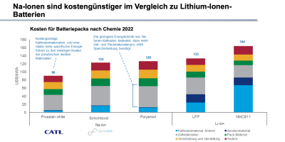 An der Kathode können zum Beispiel Farbstoffe wie Preußisch Weiß (CATL) verbaut werden. Prof. Dr. Markus Hölzle, Materialspezialist am ZSW in Baden-Württemberg, schätzt dass die Kosten einer Kilowattstunde auf Systemebene bei 80 Euro liegen. Zum Vergleich: LFP-Zellen kommen nach der Analyse von Hölzle auf 118 Euro und NMC811-Zellen auf 146 Euro.