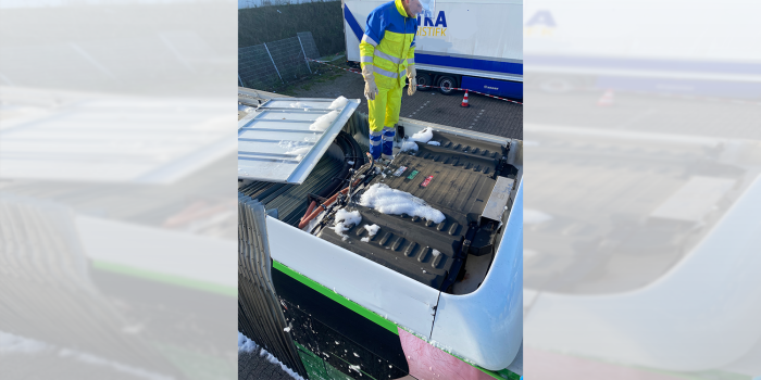 Mögliche Schäden sind nicht sofort sichtbar. Tritt bei einem herkömmlich angetriebenen Lkw Kraftstoff aus, ist das zu sehen und zu riechen. Bei einem E-Nutzfahrzeug kann nur ein Profi am Einsatzort einschätzen, ob und wie schwer ein Akku im Falle eines Unfalls beschädigt ist. Dieser gerät nicht immer sofort in Brand, ein beschädigter Akku kann mitunter erst Tage nach dem Unfall Feuer fangen. Auch ein gelöschter Akku kann sich nochmal entzünden. Das Fahrzeug zu fluten, ist allerdings Unsinn, da es dabei komplett zerstört und zum Gefahrgut wird. Denn wenn die Batterie mit Wasser in Berührung kommt, entsteht eine chemische Reaktion. Unsere Experten entfernen also, wenn nötig, den Akku vom Fahrzeug, lagern ihn fachgerecht in zertifizierten Boxen, sodass von ihm keine Gefährdung mehr ausgeht, und führen ihn dann sofort dem Recycling zu.