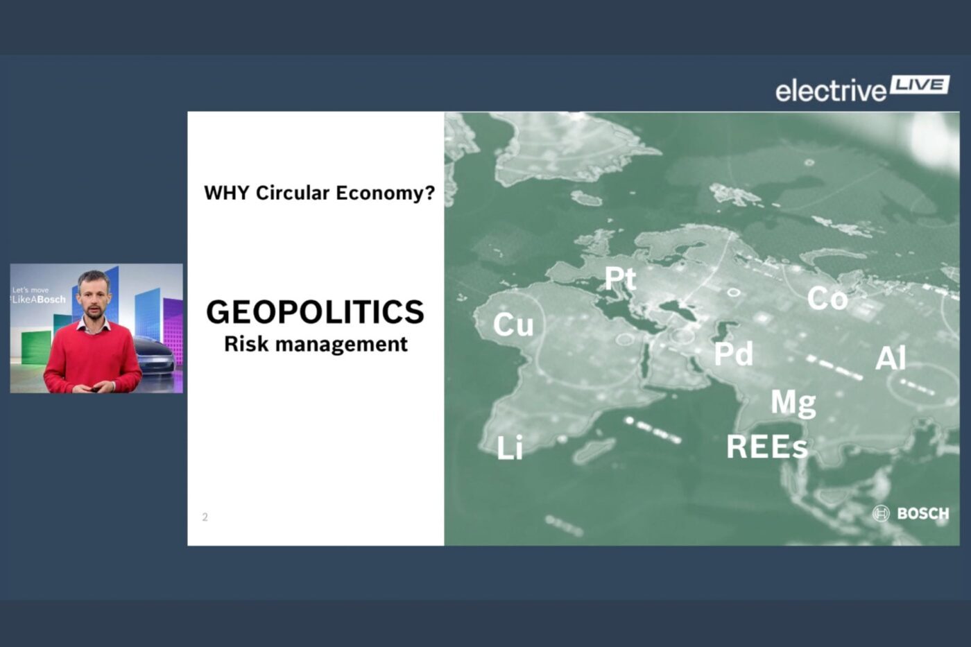 Im zweiten Vortrag kommt mit Thomas Triboulet ein Vertreter von Bosch zu Wort. Der Franzose stellt aber nicht die neuesten Entwicklungsergebnisse des Zulieferers beim Design der Rotoren oder dem hochintegrierten Gesamtsystem vor. Triboulet ist Director Sustainability Powertrain Solutions bei der Robert Bosch GmbH – und damit für die Kreislaufwirtschaft verantwortlich.